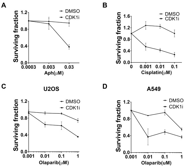 Figure 5: CDK1 inhibition resulted in increased sensitivity to multiple genotoxic agents A. Synergistic effects between aphidicolin (Aph) and CDK1 inhibitors. Clonogenic assays using U2OS cells treated with increasing concentrations of Aph in the absence or presence of 1 µM CDK1i were conducted. Colony numbers in each group (DMSO or CDKi) were scored as surviving fraction relative to cells without Aph treatment. B.-C. CDK1 inhibition increased the sensitivity of U2OS cells to clinically-used chemotherapeutic drugs including cisplatin B. and the PARP inhibitor, Olaparib C.. Cells were analyzed as indicated in A. D. A549 cells were treated with increasing concentrations of Olaparib in the absence or presence of 1 µM CDK1i. Data are presented as the mean±SEM of three independent experiments.