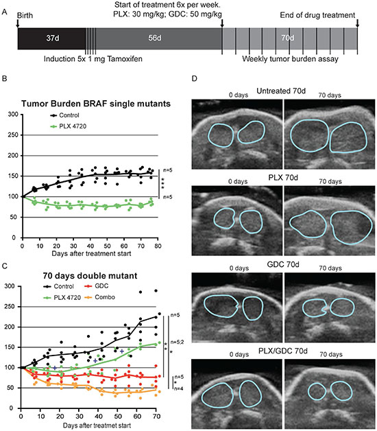 In single mutant mice, the PLX-4720 drug treatment induced a significant tumor size reduction (-20%) that lasted for more than 10 weeks, while controls increased in size by more than 50% (Figure 1B). In double mutant mice, tumors were bigger and grew faster than in single mutant. The control group grew rapidly and steadily during the 10 weeks of monitoring. PLX-4720 treated animals had a modest drug response for 3 weeks (-10%), then tumor burden resumed growth at a similar rate to control mice with a tumor burden increase of +12 percentage points per week (Figure 1C and 1D). Much to our concern, 3 out of 5 animals from this group had to be removed (crosses on Figure 1C) during the course of the experiment as they were reaching predefined endpoint criteria (see above paragraph). This worsening of the condition was only witnessed in PLX-4720 treated animals. GDC-0941 treated animals presented an initial tumor burden reduction of 20% then tumor size stabilized for the rest of the treatment period. Interestingly, when a drug combination of PLX-4720 and GDC-0941 was administered, mice showed a robust response with 60% lower tumor burden after 6 weeks followed by stabilization until the end of the experiment (Figure 1C and 1D).