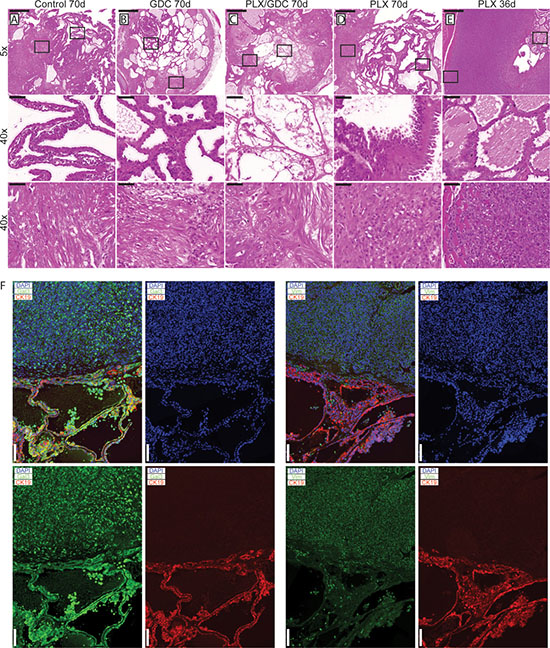 Figure 2: Histological presentation of tumors after 70 days of drug treatments. H and E staining from formalin fixed paraffin embedded and sectioned (5 μm) thyroids from double mutant mice after 70 days of treatment. Representative thyroid tissues at the end of the treatment of (A) control, (B) 50 mg/kg GDC-0941, (C) drug combination (50 mg/kg GDC-0941 and 30 mg/kg PLX-4720 and (D) 30 mg/kg PLX-4720 treated mice. (E) H and E staining of thyroid tissues from a double mutant mouse treated with PLX-4720 reaching endpoint after 36 days of treatment. Scale bars: 500 μm (upper panels) 50 μm (middle and lower panels). (F) Immunostainings of representative PTC and ATC tissues stained for Cytokeratin 19 (red) DAPI/nuclei (blue) and either Galectin-3 or Vimentin (green). Scale bars 100 μm.