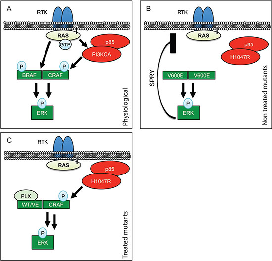 Figure 7: Schematic representation of RAF paradoxical activation. (A) In physiological conditions, upon Receptor Tyrosine Kinase (RTK) activation, receptor clustering induces RAS recruitment to the membrane. This results in dimerization of B/CRAF and subsequent phosphorylation that, in fine, induces ERK phosphorylation. (B) When BRAF is mutated to BRAFV600E it is able to dimerize without RAS recruitment and induce ERK activation independently from upstream signals. ERK activation results in Sprouty’s up-regulation (SPRY) and therefore moderation of the pathway. (C) When treated with PLX-4720, BRAFV600E is stabilized in a form that allows its dimerization with CRAF. This complex is then further stimulated by hyperactive PI3’K, leading to paradoxical ERK activation.