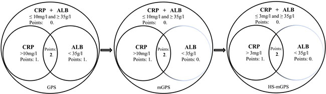 A major limitation of the present prognostic instruments, e.g. the Karnofsky performance status (KPS), the Eastern Cooperative Oncology Group (ECOG PS), and Palliative PS, is a reliance on subjective clinical measurements. Therefore, at the beginning of this century, Forrest et al. reported the first study, which combined routine objective markers of the systemic inflammatory response (CRP and ALB, termed as GPS), and showed superiority than the clinical standard combination of TNM system and ECOG PS on survivals in various cancer types [8–11]. Subsequent investigations further refined this inflammation-based prognostic system to mGPS and HS-mGPS (detailed in Figure 3). As demonstrated in this study, although both the mGPS (P < 0.001) and HS-mGPS (P < 0.001) were strong prognostic predictors for OS in LAESCC patients who received CCRT, only the HS-mGPS was a positive factor for tumor response (P = 0.015). In addition, the HS-mGPS was found to be a superior prognostic predictor compared to the mGPS for OS in multivariate analysis (P = 0.006).