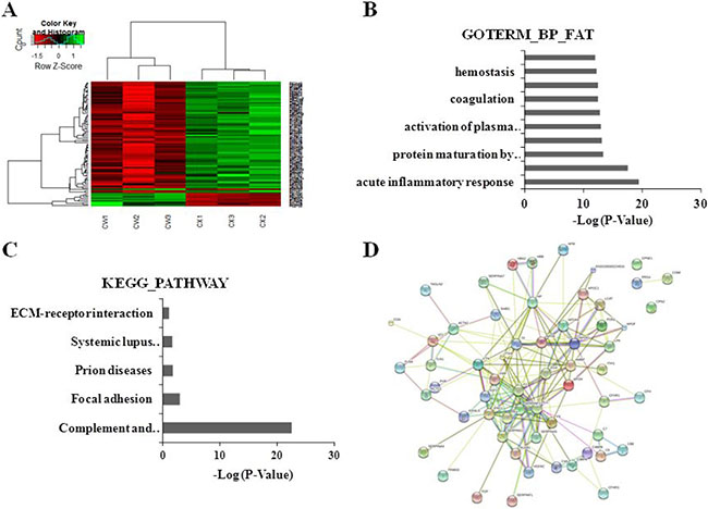 Figure 1: Clustering analyses of DEPs, functional and pathway annotation, and protein-protein interaction analysis in PCC patients with YDLKS compared to those of NS. (A) Heatmap analysis for the DEPs detected by iTRAQ combined with LC-MS/MS technologies. CW1, CW2 represented the sample from two PCC patients with YDLKS, respectively. CW3 represented the pooled samples from eight PCC patients with YDLKS. CX1, CX2 represented the samples from two PCC patients with NS, respectively. CX3 represented the pooled sample from eight PCC patients with NS. (B) GO classification (biological process) of the DEPs using DAVID functional annotation tool. (C) KEGG pathway annotation of the DEPs using DAVID functional annotation tool. (D) PPI network construction for the DEPs using the STRING database.
