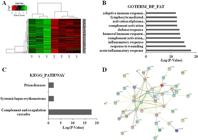 Figure 2: Clustering analyses of DEPs, functional and pathway annotation, and protein-protein interaction analysis in PLC patients with YDLKS compared to those of NS. (A) Heatmap analysis for the DEPs detected by iTRAQ combined with LC-MS/MS technologies. LW1, LW2, LW3 represented the sample from three PLC patients with YDLKS, respectively. LW4 represented the pooled sample from seven PLC patients with NS. LX1, LX2 represented the sample from three PLC patients with NS, respectively. LX3 represented the pooled sample from eight PLC patients with NS. (B) GO classification (biological process) of the DEPs using DAVID functional annotation tool. (C) KEGG pathway annotation of the DEPs using DAVID functional annotation tool. (D) PPI network construction for the DEPs using the STRING database.