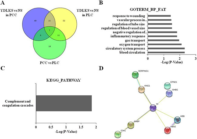 Figure 3: Clustering analyses of common DEPs in PCC and PLC, protein-protein interaction analysis, and functional and pathway annotation. (A) Venn diagrams analysis of the Common DEPs in PCC and PLC patients with YDLKS in compared to those of NS. (B) GO classification (biological process) of the DEPs using DAVID functional annotation tool. (C) KEGG pathway annotation of the DEPs using DAVID functional annotation tool. (D) PPI network construction for the DEPs using the STRING database.