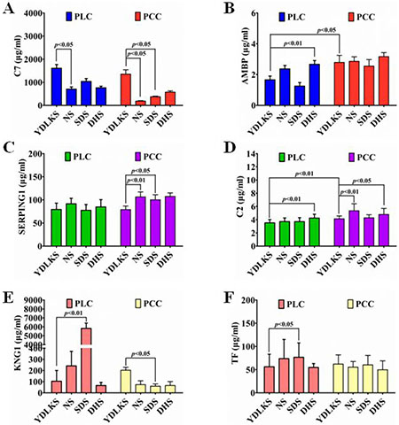 Preliminary validation results indicated that, plasma C7 and SERPING1 may be valuable characteristic proteins for both PLC and PCC patients with YDLKS. C2 may be one of the valuable characteristic proteins for PCC patients with YDLKS. In PCC, plasma C7, SERPING1 and KNG1 may be the characteristic proteins to make a distinction between YDLKS and SDS, and plasma C2 may be the characteristic protein to make a distinction between YDLKS and DHS. In PLC, plasma KNG1 and TF may be the characteristic proteins to make a distinction between YDLKS and SDS, and plasma AMBP and C2 may be the characteristic proteins to make a distinction between YDLKS and DHS. In addition, the plasma levels of AMBP and C2 may be characteristic proteins to make a distinction between PLC with YDLKS and PCC with YDLKS.