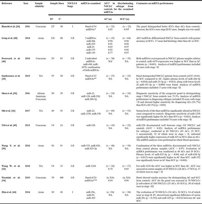 The NSCLC patient groups differed by clinicopathological status across the studies and some relevant data were missing. Regarding the patients’ smoking status and comorbidities, four studies did not report any data on smoking [41–44]; two studies included only smokers (with > 20 mean pack-years) [26, 30]; five studies included ≥ 85% of smokers among NSCLC patients [27, 29, 45–47]. Fourteen of the 20 studies provided no information on comorbidity of the patient cohort; the other 6 studies indicated that patients had no history of other cancers (Supplementary Table 1A) [26, 48–52]. A mix of the two main subtypes of NSCLC, AC and SCC, was present in all the selected papers, however only in 11 studies the accuracy of the miRNA profile of NSCLC was separately evaluated for AC and SCC [26, 29, 30, 41, 44, 46, 48–50, 53, 54]. The composition of control groups was also varied (Supplementary Table 1A). Four studies [30, 44, 53, 55] provided no medical information on the control group. In 4 studies, history of no tumor and negative chest imaging (X-rays or CT scan) were used to identify healthy controls [26, 46, 47, 51]. In the other 12 studies, individuals broadly defined “healthy subjects” or “non-neoplastic subjects” based on medical history, served as controls; 3 of these studies included patients with chronic obstructive pulmonary disease (COPD) [29, 45, 47] and 4 studies included controls with benign pulmonary nodules or non-cancerous lung disease [45, 48, 50, 52].