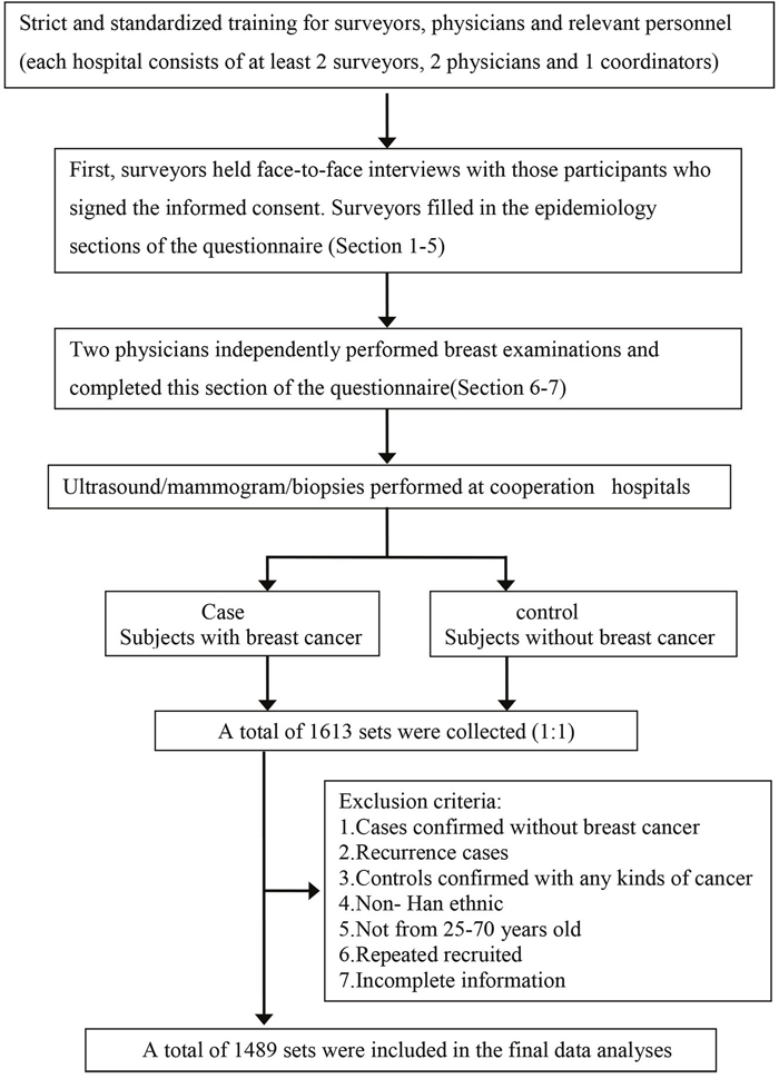 The target population was female outpatients with breast cancer aged 25–70 years in 21 hospitals. Cases and controls were matched (1:1) on age (± 3 years), diagnosis hospital (same hospital), and timing of examination (within 2 months). Inclusion criteria for breast cancer cases were: (1) newly diagnosed and histologically confirmed breast cancer; (2) Han ethnic group; and (3) females aged 25–70 years. Exclusion criteria for patients with breast cancer were: recurrent or metastatic breast cancer, complication of other malignant tumors by clinical or pathological diagnosis, and <25 or >70 years of age. Inclusion criteria for the control group were: (1) negative physical examination results; (2) negative ultrasound scans of breast and/or mammographic screening results; (3) no evidence of cancer or history of cancer; and (4) Han ethnic group. Patients who had a neoplastic disease at any other site, or history of cancer or other major chronic disease were excluded from the study. Data collection strictly adhered to the inclusion and exclusion criteria. After excluding those with inadequate information or missing data, 1489 case-control pairs were involved in this study.