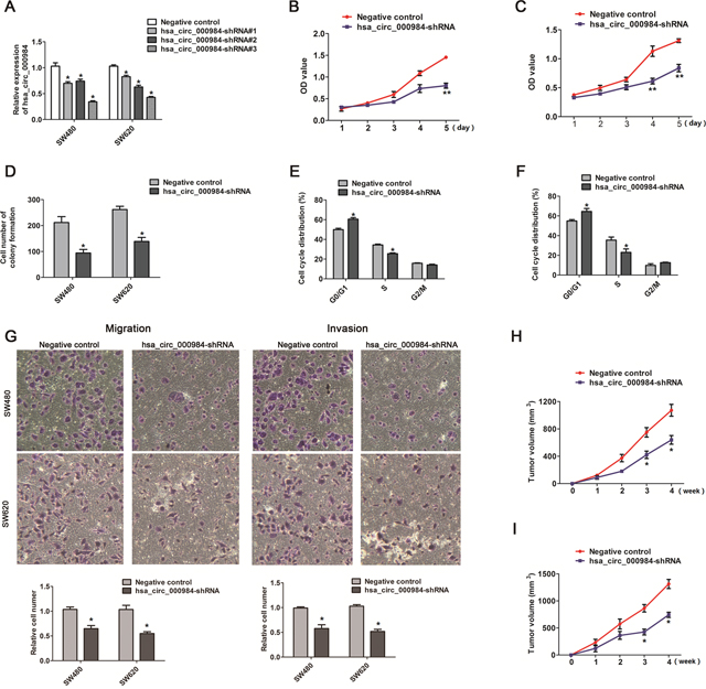 Figure 2: The effect of hsa_circ_000984 on cell proliferation, migration, invasion and tumor formation. (A) qRT-PCR analysis of knockdown efficiency of hsa_circ_000984 in SW480 and SW620 cells transfected with shRNAs (shRNA#1, shRNA#2 and shRNA#3) targeting hsa_circ_000984 or a control shRNA (Negative control). Data are shown as mean ± SD for three independent experiments (n=3). *P<0.05, two-side Student’s t-test. (B and C) CCK-8 assay showed that CRC cells with stable expressing hsa_circ_000984 shRNA grew slower compared to the controls. **P<0.001, two-side Student’s t-test. Data are shown as mean ± SD for three independent experiments (n=3). (D) Colony formation assay showed that the knockdown of hsa_circ_000984 in CRC cells evidently reduced the numbers of colonies. (E) SW480 and (F) SW620 cells with stable expressing hsa_circ_000984 shRNA were mainly arrested in G0/G1 phase. (G) Migration and invasion assays for CRC cells with stable expressing hsa_circ_000984 shRNA and negative control. *P<0.05, two-side Student’s t-test. Data are shown as mean ± SD for three independent experiments (n=3). (H) SW480 and (I) SW620 cells with stable expressing hsa_circ_000984 shRNA were subcutaneously implanted in nude mice (n=8/group), and there was a statistical significance of tumor size between hsa_circ_000984 knockdown groups and control groups in the 28th day. *P<0.05, two-side Student’s t-test. All data indicate mean ±SD.