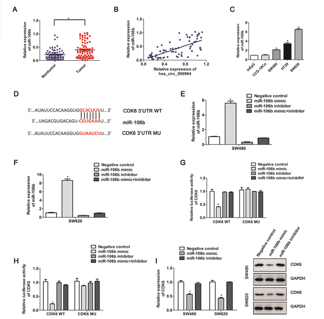 Figure 3: The correlation between CDK6 expression and miR-106b in CRC cells. (A) MiR-106b expression in CRC tissue samples and those matched colorectal nontumorous tissues were detected by qRT-PCR. *P<0.05, paired t-test. (B) The correlation analysis between hsa_circ_000984 expression level and MiR-106b expression level in CRC samples (P<0.05, logistic regression analysis). (C) miR-106b expression was up-regulated in the CRC cell lines compared with CCD-18Co and InEpC cells. (D) Schematic representation of CDK6 3’-UTR and the miR-106b target site. The full-length of CDK6 3’-UTR containing miR-106b target site was inserted downstream of the firefly luciferase gene in psiCHECK2 to create the psiCHECK2-CDK 3’UTR-WT plasmid (Wt). The full-length of CDK6 3’-UTR deleted miR-106b-binding sequence was inserted downstream of the firefly luciferase gene in psiCHECK2 to create the psiCHECK2-CDK6 3’UTR-MU plasmid (MU). miR-106b expression levels in SW480 cells (E) and SW620 cells (F) co-transfected with miR-106b mimic or inhibitor. (G and H) luciferase activity was measured after CRC cell lines (SW480 and SW620) were transfected with CDK6 3’UTR-WT plasmid or CDK6 3’UTR-MU plasmid and the miR-106b mimic or inhibitor. (I) SW480 cells and SW620 cells were transfected with miR-106b mimic or inhibitor for 48 h. CDK6 mRNA level and protein level were measured by qRT-PCR and western blotting assays. Results are indicated as mean ±SD (n=3); *P<0.05, two-side Student’s t-test.