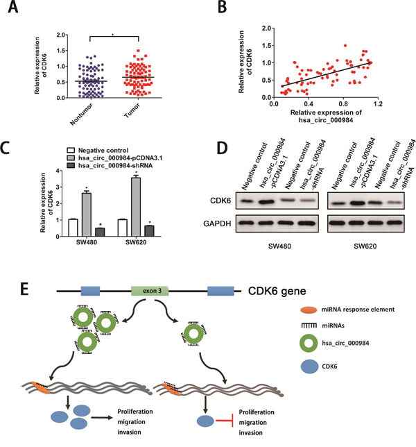 Figure 4: Hsa_circ_000984 may serve as miR-106b sponge to regulate its circRNA-miRNA-mRNA network. (A) The expression levels of CDK6 in CRC tissue samples and their paired normal samples. The result showed that CDK6 expression in CRC tissue was significantly higher than those in corresponding nontumorous tissues (*P<0.05, paired t-test). (B) A significantly positive correlation was found of hsa_circ_000984 expression level with CDK6 expression level. CRC cell lines were transfected with hsa_circ_000984-shRNA or hsa_circ_000984-pCDNA-3.1 vectors, respectively. *P<0.05, two-side Student’s t-test. The expression of CDK6 were monitored by qRT-PCR (C) and western blotting assays (D). (E) Schematic illustration of biological roles of hsa_circ_000984 in CRC carcinogenesis. Hsa_circ_000984 can bind to miR-106b as a miRNA sponge, exerting its function via regulating the downstream target CDK6, and knockdown of hsa_circ_000984 could inhibit CRC cell proliferation, migration, invasion in vitro and tumor formation in vivo, respectively.