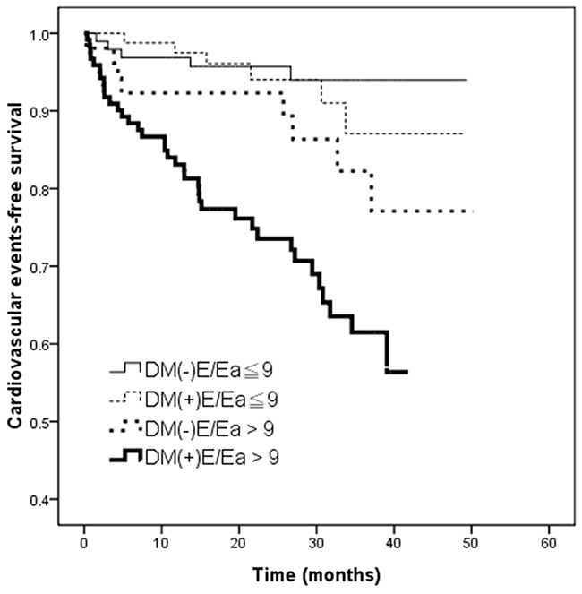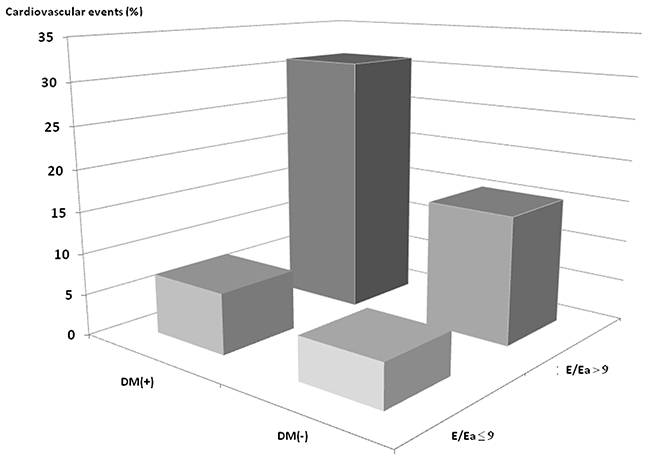 Despite these findings, whether or not a combination of the presence of DM and the E/Ea ratio can predict adverse CV outcomes in patients with CKD has rarely been investigated. Therefore, this study aimed to examine whether a combination of DM and E/Ea ratio was independently associated with CV events in CKD stage 3−5 patients. Furthermore, the present study also assessed the incremental value of echocardiographic parameters in predicting CV events.