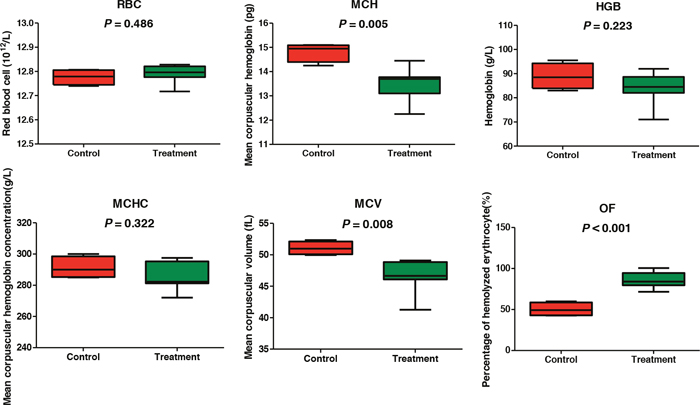 RBC parameters, including the amounts of RBC, HGB, mean corpuscular HGB and volume (MCH and MCV, respectively), and mean corpuscular HGB concentration (MCHC) were determined using a Mindray BC-2800Vet auto hematology analyzer (Shenzhen Mindray Bio-Medical Electronics Co., Ltd., Shenzhen, China). Osmotic fragility determination was performed according to a previously described method [33] by measuring the percentage of hemolyzed RBC in a solution of 0.8% NaCl-phosphate buffer, which was compared with that observed in distilled water (100% hemolysis).