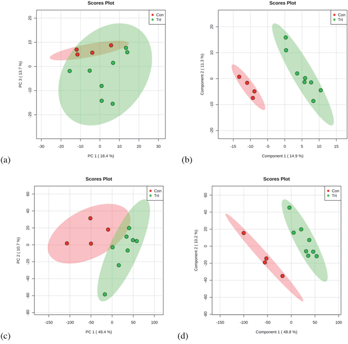 Figure 3: PCA and PLS-DA based on data derived from GC-MS (a, b) and UPLC-QTOF (c, d) metabolomics analysis of red blood cell from dairy cows from the control and gossypol-treated groups.