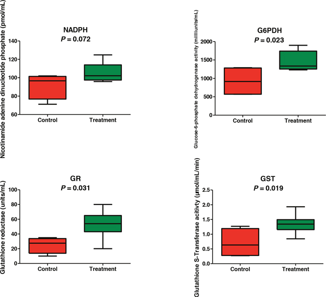 Because both the metabolomics and proteomics results consistently indicated that the oxidation-reduction is one of the most responsive pathways to the gossypol treatment, activity assays were performed for 6-phosphogluconate dehydrogenase, NADHP, glutathione S-transferase, and glutathione reductase. As shown in Figure 4, the activities of 6-phosphogluconate dehydrogenase, glutathione S-transferase, and glutathione reductase in the gossypol-treated group were all higher than those in the control group (p = 0.023, 0.019 and 0.031, respectively). We also measured the concentrations of NADPH using commercial kits and found that the levels of NADPH in the gossypol-treated group were increased (p = 0.072). These results showed a strong correlation with the proteomics data.