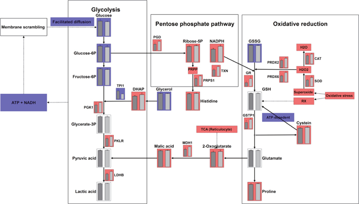 The most important task of red blood cell (RBC) is to bind and transport oxygen, which requires passage through microcapillaries. The latter is achieved by a drastic modification of its biconcave shape, made possible only by the loss of the nucleus and cytoplasmic organelles and, consequently, the lack of ability to synthesize proteins [7]. Yet, a number of vital pathways are still active in RBC, which contributed to generate energy and reducing power to perform its essential functions [8]. As soon as the RBC cannot fulfill its vital functions anymore, it will eventually lose its biconcave shape and eryptosis happens. Therefore, it is important to consider that RBC can accumulate modifications on metabolites and proteins that represent the long-term status of the body. However, the degree of hemolysis not only depends on the severity of RBC functions impairment, but also relies on the ability to compensate for the abnormalities by reticulocytes.