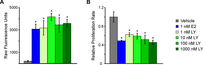 Figure 1: Estrogen, and the ERβ-agonist, LY500307, activate ERβ transcriptional activity and decrease cell proliferation in TNBC cells. A. A luciferase reporter construct containing an estrogen response element was transiently transfected into ERβ expressing MDA-MB-231 cells and subsequently treated as indicated for 24 hours prior to assessing luciferase activity. B. Crystal violet assays indicating the effects of increasing concentrations of LY500307, an ERβ-selective agonist, on MDA-MB-231-ERβ cell proliferation rates relative to vehicle control or E2 treatment. Treatments were performed in the presence of doxycycline for five days. * Denotes significance at the P ≤ 0.05 level compared with vehicle control.