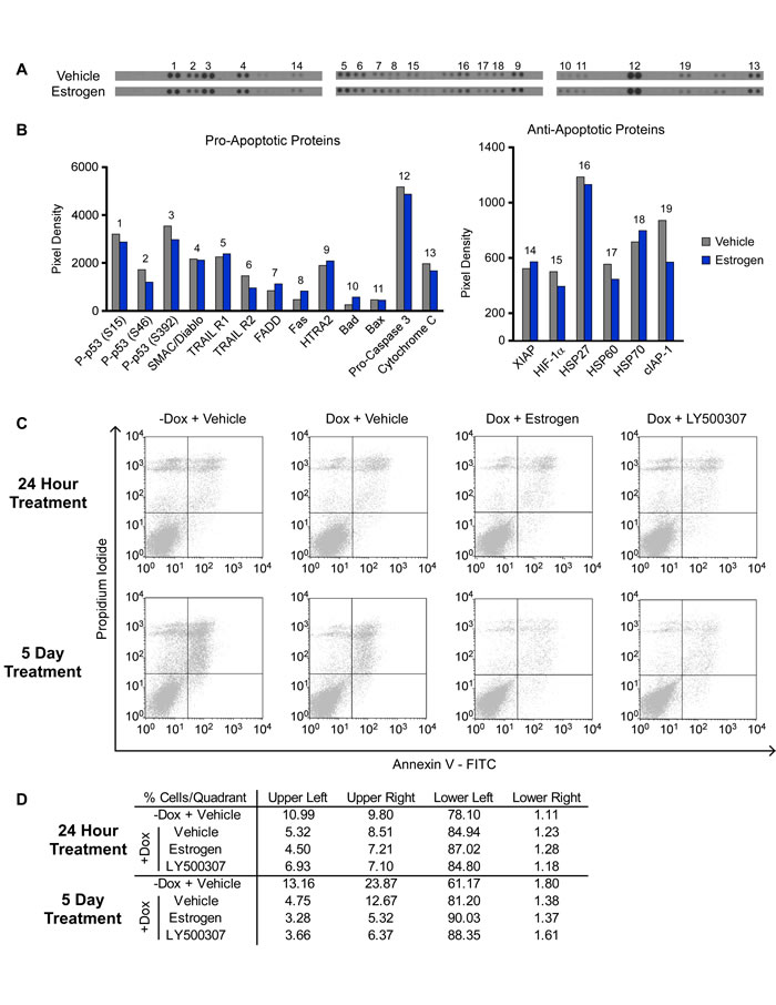 Figure 2: Effects of ERβ on Apoptosis of TNBC cells. A. and B. A protein-based apoptosis array was used to assess the effects of 1 nM E2 treatment (24 hours) of ERβ expressing MDA-MB-231 cells on the expression levels of multiple pro- and anti-apoptotic proteins. C. and D. Annexin V staining of MDA-MB-231-ERβ cells following 24 hours and 5 days of treatment with vehicle, 1 nM estrogen or 10 nM LY500307 as determined by flow cytometry.