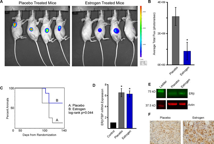 Figure 4: Estrogen inhibits MDA-MB-231-ERβ cell line xenograft growth. Ovariectomized athymic nude mice harboring MDA-MB-231-ERβ-Luc cell line xenografts were randomized to placebo control or E2 treatment groups (n = 8 animals per group). A. Tumor progression was monitored at 8 weeks via IVIS2000 xenogen imaging and B. average total flux was quantified. C. Time to tumor doubling was calculated following weakly tumor measurements and a log-rank test was used to assess difference between treatment groups. D. The level of ERβ mRNA expression was determined in residual tumors isolated from placebo and E2 treated mice at the time of sacrifice by RT-PCR and was normalized to No Dox/Veh control treated cells. E. Western blotting and F. immunohistochemistry of tumor lysates and FFPE tumor sections respectively indicating ERβ protein expression levels in residual tumors isolated from placebo and E2 treated mice. * Denotes significance at the P ≤ 0.05 level compared with vehicle control.