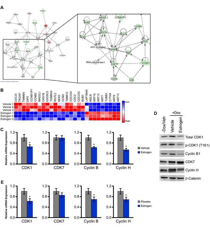 Figure 5: ERβ suppresses a network of genes involved in cell cycle control. A. Ingenuity pathway analysis was performed using microarray data of E2 regulated genes in MDA-MB-231-ERβ cells following 5 days of treatment and revealed suppression of a cell cycle related network. B. Heat map analysis indicating relative expression of genes comprising this network in vehicle and E2 treated MDA-MB-231-ERβ cells. C. Independent qPCR analysis of estrogen mediated effects on the expression of CDK1, CDK7, cyclin B1 and cyclin H. D. Protein levels of total CDK1, p-CDK1, cyclin B1, CDK7 and cyclin H in Dox-induced estrogen and LY500307 treated MDA-MB-231-ERβ cells relative to non-dox treated controls. B-catenin is shown as a loading control. E. mRNA levels of indicated genes in residual tumors isolated from placebo and E2 treated mice. * Denotes significance at the P ≤ 0.05 level compared with placebo control.