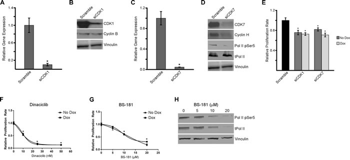 Since estrogen and LY500307 resulted in decreased expression of CDK1 and CDK7, we sought to further analyze the roles of these two proteins in regulating cell proliferation and cell cycle progression in TNBC cells. As a first step, we performed siRNA-mediated knockdown of CDK1 and CDK7 in MDA-MB-231 cells. A pool of CDK1 or CDK7 siRNAs was shown to substantially decrease the mRNA (Figure 6A and 6C) and protein levels (Figure 6B and 6D) for each of these genes. Interestingly, knockdown of CDK7 also resulted in decreased expression of its binding partner, cyclin H, as well as the phosphorylation of serine 5 at the C-terminal domain of RNA polymerase II (Figure 6D). siRNA-mediated suppression of CDK1 and CDK7 also resulted in significant decreases in the proliferation rates of MDA-MB-231 cells, effects that were independent of the presence or absence of ERβ expression (Figure 6E). To confirm these effects, dose-response curves were generated using the CDK1 inhibitor, dinaciclib (Figure 6F), and the CDK7 inhibitor, BS-181 (Figure 6G). Proliferation assays revealed potent inhibition of MDA-MB-231 proliferation rates by both drugs in ERβ+ (dox) and ERβ- (no dox) cell lines after six days. As seen with siRNA knockdown, drug inhibition of CDK7 with BS-181 at or above the IC50, also showed altered protein levels of total RNA polymerase II and RNA polymerase II phospho-serine 5 (Figure 6H). These data demonstrate that knockdown, or drug-mediated inhibition, of CDK1 and CDK7 results in decreased proliferation in TNBC cells regardless of ERβ expression. In addition, CDK7 inhibition also has an effect on the phosphorylation of RNA polymerase II and therefore might play a dual role in cell cycle progression and transcription.