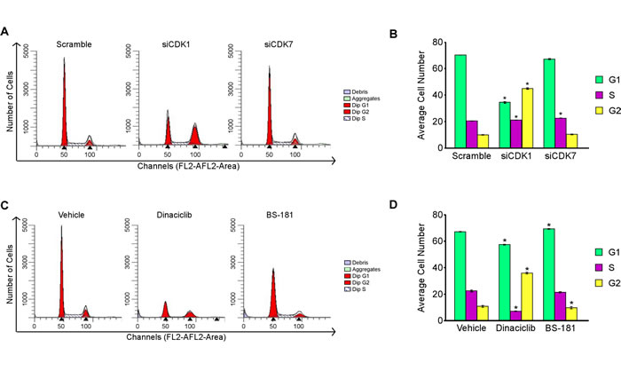 Figure 7: Effects of CDK1 and CDK7 inhibition on cell cycle progression. Flow cytometry analysis of MDA-MB-231 cells following 48 hours of siRNA mediated knockdown of CDK1 and CDK7 A. and B. or drug mediated inhibition of CDK1 (10 nM dinaciclib) and CDK7 (20 µM BS-181) C. and D. relative to scrambled siRNA control or vehicle treated cells respectively. Transfections were performed with a pool of the two CDK1 or CDK7 siRNAs, or the control siRNA, at a final concentration of 25 nM. * Denotes significance at the P ≤ 0.05 level between the indicated treatments and controls.