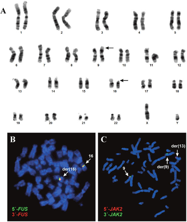 Fluorescence in situ hybridization (FISH) was performed on metaphase spreads using the Vysis FUS (16p11) break-apart FISH Probe (Abbott Molecular, Illinois, USA) and the Kreatech JAK2 (9p24) break-apart FISH probe (Leica Biosystems, Newcastle, UK). Fluorescent signals were captured and analyzed using the CytoVision system (Leica Biosystems).