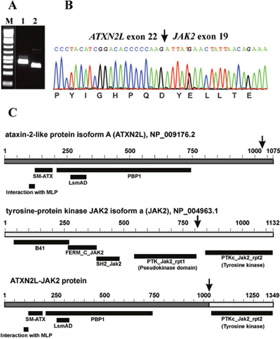 RT-PCR with the ATXN2L-3108F1 and JAK2-3084R1 primer combination amplified a 358 bp cDNA fragment (data not shown). Nested PCR with the primer combinations ATXN2L-3116F1/JAK2-3006R1 and ATXN2L-3183F1/JAK2-3044R1 amplified 283 bp and 254 bp cDNA fragments, respectively (Figure 2A). Sanger sequencing of the amplified products showed a chimeric ATXN2L-JAK2 cDNA fragment in which the fusion point was identical to that found using TopHat-Fusion (Figure 2B; Table 1).