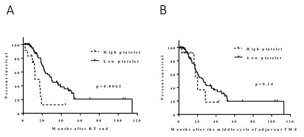 Figure 2: Effect of the change in platelets following CRT (A): the high-platelet group had significantly shorter survival durations than did the low-platelet group (median, 11 and 28 months; p = 0.0062). Effect of the change in platelets during adjuvant TMZ (B): no significant survival difference was found between the high and low platelet groups (median, 22 and 17 months; p = 0.1).