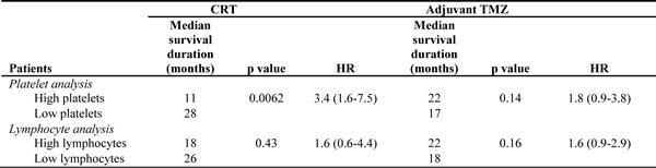 These findings also confirm those of a report by Williams et al. [24], who found that a reduction in platelet count during CRT is predictive of prolonged survival. They measured the change in platelets at weeks 1 and 6 of a radiation therapy course and found that patients who experienced an increase in platelets had a shorter survival duration than did patients who did not; the median survival durations were 11.8 months versus 19.6 months, respectively. In our study, we not only investigated the change in platelets after CRT but also during adjuvant TMZ and found that the change during adjuvant TMZ was not correlated with survival duration. It is possible that after completing CRT, some patients experienced a reduction in platelet count to lower than the normal baseline; therefore, after they experienced an increase of >30%, their counts still did not exceed the upper normal limit. Consequently, the survival durations between the low- and high-platelet count groups during adjuvant TMZ were not significantly different.