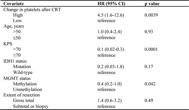 We performed a multivariable analysis of survival to adjust for known prognostic covariates on the prognostic significance of platelet changes. Our findings revealed that MGMT status, KPS, and an increase in platelets after CRT were significantly associated with survival (HR for platelets, 4.5; 95% CI, 1.6-12.6). In our cohort, patient age, IDH mutational status, and extent of resection were not significantly associated with survival (Table 3).