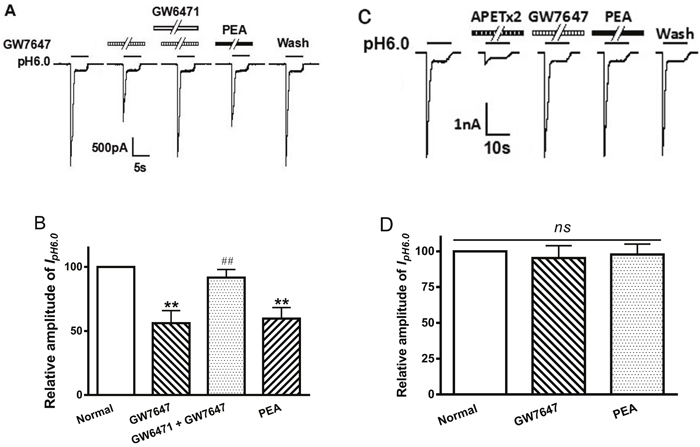 Figure 3: Involvement of PPAR-α in GW7647 inhibition of proton-gated currents. The current traces in (A) and bar graphs in (B) show that the inhibiting effect of IpH6.0 by GW7647 (3×10-8M) pre-applied alone for 2 min in rat DRG neurons was abolished by the co-application of GW7647 and GW6471 (10-7 M), a selective PPAR-α antagonist, and mimicked by PEA (10-5 M), an endogenous ligand of the PPAR-α. Statistical tests were performed using one way analysis of variance followed by post hoc Bonferroni’s test, and significance is shown as follows: **P < 0.01, compared with normal column; ##P < 0.01, compared with GW7647 column. n = 10 in each column. The current traces in (C) and bar graphs in (D) show that GW7647 (3×10-8M) and PEA (10-5 M) had no effect on IpH6.0 in CHO cells expressing ASIC3 channel but not PPAR-α. Representative traces show currents evoked by a pH 6.0 acidic solution for 5 s in CHO cells expressing ASIC3. The proton-gated current could be blocked by 2 μM APETx2, a specific ASIC3 inhibitor. Currents were normalized to control (100%, white column). n = 10 in each column.