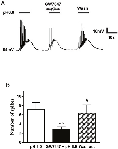 Figure 4: Effect of GW7647 on proton-evoked action potentials of rat DRG neurons. (A). Action potentials were evoked by a pH 6.0 acidic stimulus for 5 s with current-clamp recording in the presence of capsazepine (10 μM) or AMG 9810 (1 μM) to block proton-induced TRPV1 activation. The pretreatment of GW7647 (3×10-8 M, 2 min) decreased the acidosis-induced the number of action potentials. (B). Bar graph shows the effect of GW7647 (3×10-8 M) on the number of action potentials produced by pH 6.0 acidosis perfusions. After 20 min washout of GW7647, acidosis-evoked action potentials recovered to control condition. **P < 0.01, paired t-test, compared with pH 6.0 column alone; #P < 0.05, paired t-test, compared with GW7647 + pH 6.0 column, n = 7 in each column.