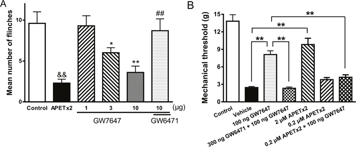 Figure 5: Effects of GW7647 on nociceptive responses to injection of acetic acid and mechanical hypersensitivity induced by injection of CFA into the hind paw in rats. (A). The bar graph shows that the nociceptive responses evoked by intraplantar injection of acetic acid (50 μl, pH 6.0) in the presence of the TRPV1 inhibitor capsazepine (100 μM). The acidosis-evoked nociception was blocked by pretreatment with APETx2 (50 μl, 20 μM), a blocker of ASIC3. The pretreatment of GW7647 decreased flinching behavior induced by acetic acid in dose-dependent manner (10-100 ng). The effect of GW7647 (100 ng) was blocked by co-treatment of GW6471 (300 ng). Each bar represents the number of flinches that animals spent licking/lifting the injected paw during first 5-min observation period (mean ± SEM of 10 rats in each group). &&P < 0.01, *P < 0.05, **P < 0.01, Bonferroni’s post hoc test, compared with control; ##P < 0.01, Bonferroni’s post hoc test, compared with GW7647 (100 ng) column. (B). Bar graph shows that effects of GW7647 and APETx2 on CFA-induced mechanical hypersensitivity in rats. Mechanical hypersensitivity was produced by injection of CFA into the left hind paw. Twenty-four hours following CFA injection, vehicle and drugs (50 μl) were pretreated into the inflamed hind paw. The pretreatment of GW7647 (100 ng) suppressed mechanical hypersensitivity. The effect of GW7647 (100 ng) was blocked by co-treatment of GW6471 (300 ng). Mechanical hypersensitivity was also suppressed by 2 μM APETx2, but not by 0.2 μM APETx2. The antihyperalgesic effect of GW7647 (100 ng) disappeared when co-treatment of 0.2 μM APETx2. Control column, baseline response before CFA injection. Mean ± SEM of 12 rats in each group. **P < 0.01, Bonferroni’s post hoc test.