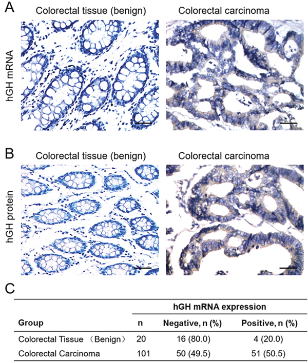 Figure 1: Expression of hGH in benign colorectal tissue and colorectal carcinoma (CRC). (A) In situ hybridization analysis of hGH mRNA expression in normal colorectal normal tissue and CRC. Images were counterstained with hematoxylin and captured at ×400 magnification. (B) Immunohistochemical analysis of hGH protein expression in normal colorectal tissue and CRC. Images were counterstained with hematoxylin and captured at ×200 magnification. Positive reactivity to hGH mRNA or protein is indicated by the brown color. (C) Percentages of normal colorectal tissue and CRC positive for hGH mRNA (p<0.05).