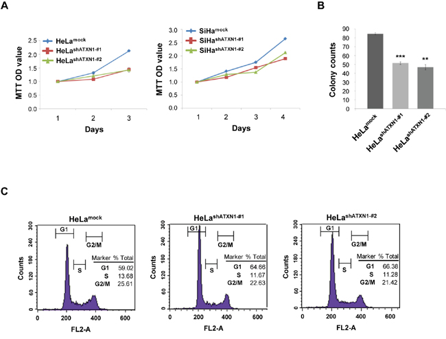 To further demonstrate the importance of ATXN1 in cell proliferation, we performed colony-formation assays using HeLashATXN1-#1 and HeLashATXN1-#2 cells and found that each cell line formed fewer colonies compared with the controls (Figure 1B). To determine the mechanism underlying this effect, we performed flow cytometry analysis and found that the number of G1-arrested HeLashATXN1-#1 and HeLashATXN1-#2 cells had increased and that of the S-cells showed a decrease compared with that of the controls (Figure 1C). These results indicate that the knockdown of ATXN1 inhibits the proliferation of cervical cancer cells.