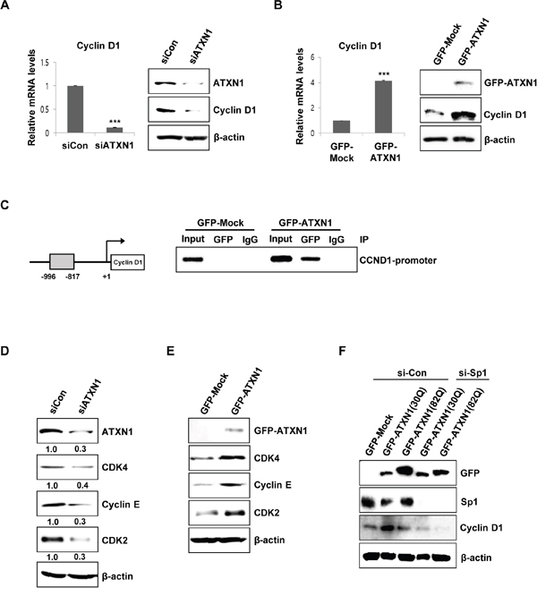 Figure 2: ATXN1-mediated regulation of cyclin D1 and cell cycle-associated proteins. (A) Left panel: sicontrol (siCon) and siATXN1 were used to transiently transfect SiHa cells, and mRNA levels were estimated using real-time qRT-PCR. Right panel: SiHa cells were transfected with siCon and siATXN1. Cyclin D1 levels were measured 48 h after transfection using western blotting. (B) Left panel: GFP-Mock and GFP-ATXN1 were used to transiently transfect SiHa cells, and the mRNA levels were estimated using real-time qRT-PCR. Right panel: SiHa cells transfected with GFP-Mock and GFP-ATXN1. The levels of cyclin D1 were measured after 48 h using western blotting. (C) Left panel: Cyclin D1 promoter constructs. Right panel: Chromatin extracts of SiHa cells expressing GFP-Mock and GFP-ATXN1 were immunoprecipitated using an anti-GFP antibody, and the immunoprecipitates were amplified with PCR using cyclin D1 (CCND1) primers. (D) SiHa cells were transfected with siCon and siATXN1. The levels of CDK4, cyclin E, and CDK2 were measured 48 h after transfection using western blotting. Densitometry results of protein are shown below each lane. Protein expression was normalized to β-actin levels. Numbers indicate the intensity ratio relative to each control lane (1.0). (E) SiHa cells transfected with GFP-Mock and GFP-ATXN1. The levels of CDK4, cyclin E, and CDK2 were measured after 48 h using western blotting. (F) Western blotting analysis of SiHa cells transfected with GFP-Mock, GFP-ATXN1(30Q) and GFP-ATXN1(82Q) in the presence or absence of Sp1 siRNA was performed to determine the expression of cyclin D1. IP, immunoprecipitation; CCND1, Cyclin D1. All data were generated from three independent experiments. *P < 0.05; **P < 0.01; ***P < 0.001, t-test.
