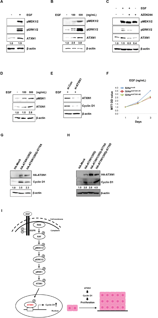 Figure 3: Upstream EGFR–RAS–MAPK pathway components regulate ATXN1 levels. (A) The expression level of ATXN1 under the presence (+) and absence (−) of EGF, as examined by western blotting. ATXN1 levels were upregulated upon EGF stimulation along with the upregulation of pMEK1/2 and pERK1/2. β-actin was used as the loading control. (B) SiHa cells were treated with 0, 100, and 500 ng/mL of EGF for 48 h. Total lysates were harvested and then western blotting was performed using the indicated antibodies. (C) SiHa cells were starved in 0.1% FBS for 4 h before treatment. The cells were grown in RPMI medium containing EGF (500 ng/mL) and AZD6244 (1.5 μM) alone for 48 h. EGF + AZD6244: SiHa cells were pretreated with AZD6244 for 1 h prior to the addition of EGF. Untreated control cells were maintained in RPMI with DMSO. ATXN1, pMEK1/2, and pERK1/2 were detected by western blotting. (D) SiHa cells were treated with 0, 100, and 500 ng/mL EGF for 48 h. Total lysates were harvested for western blotting using the indicated pMSK1 and ATXN1 antibodies. (E) SiHa cells were transfected with siCon or siATXN1. SiHa cells containing siCon and siATXN1 were treated with EGF in RPMI for 48 h. Total lysates were harvested and then western blotting was performed using the indicated antibodies. (F) The proliferation rates of SiHa cell lines stably transduced with ATXN1 shRNAs (SiHashATXN1-#1 and SiHashATXN1-#2) were measured using the MTT assay. SiHashATXN1-#1 and SiHashATXN1-#2 cell lines were treated with EGF at the indicated times for 72 h. (G) SiHa cells were transfected with HA-ATXN1 or HA-ATXN1(S776A). The levels of cyclin D1 were measured after 48 h using western blotting. (H) SiHa cells were transfected with HA-ATXN1 or HA-ATXN1(S776D). The levels of cyclin D1 were measured after 48 h using western blotting. All data are expressed as the means and S.D. of three independent experiments. Protein expression was normalized to β-actin levels. Numbers indicate the intensity ratio relative to each control lane (1.0). (I) Left panel: The hypothesized model of ATXN1 signaling involved in the EGF-induced increase in cell proliferation. EGF activates receptor tyrosine kinase, which stimulates Src kinase. Receptor tyrosine kinases, including EGF receptors, signal through their activation of RAS and downstream cascade RAF, MEK1/2, and ERK1/2 to regulate cell proliferation. Finally, these molecules may induce ATXN1, which increases cell cycle regulatory proteins. Right panel: ATXN1 promotes growth of cervical cancer cells by upregulating cyclin D1 during the early stages of tumor development, which in turn promotes the growth of cervical cancer cells that subsequently form a tumor.