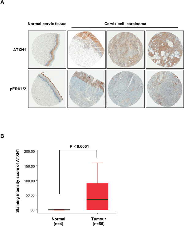 Figure 5: Histological analysis of human cervical cancer tissues. (A) Immunohistochemical (IHC) analysis of tissue microarrays prepared from human cervical cancers tissues were treated with an antibody against ATXN1 and pERK1/2. Representative samples of ATXN1 and pERK1/2 expression in normal tissues and cervical cancer tissues are shown. (B) The correlation plot of H-score quantification for ATXN1. Relative ATXN1 expression levels in cervical tumours (n=55) were compared with that of normal tissues (n=4). Box and whiskers indicate minimum to maximum percentiles in this figure: center line, median value; upper box limit, 75% percentile; lower box limit, 25% percentile; whiskers, minimum or maximum values. Values are means ± SD. P-values were obtained using independent t-test to compare ATXN1 expression between the cervical uterine and cervical carcinoma groups.