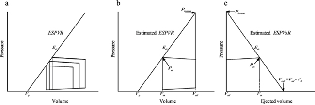 Figure 1: Diagrams to the conventional ESPVR determined by a set of three pressure–volume loops (a), the estimated ESPVR obtained by a single pressure–volume loop on the basis of the estimated Pisomax (b), and the estimated ESPVsR determined by the pressure–ejected volume curve on the basis of the estimated Pisomax (c). Ees, end-systolic elastance; ESPVR, end-systolic pressure–volume relationship; ESPVsR, end-systolic pressure–stroke volume relationship; Pes, end-systolic pressure; Pisomax, peak isovolumic pressure; Ved, end-diastolic volume; Veed, effective end-diastolic volume; Ves, end-systolic volume; V0, zero-pressure volume axis intercept.