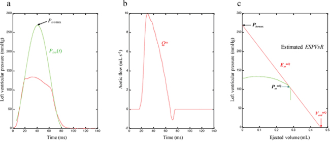 Figure 2: ESPVsR line (red line, c) estimated from the pressure-ejected volume curve (green line, c), which is obtained by the measured LV pressure (red line, a) and time integration of the Qm (b) in a healthy rat. ESPVsR, end-systolic pressure-stroke volume relationship; EesmQ, end-systolic elastance calculated from the LV pressure and Qm; LV, left ventricular; PesmQ, end-systolic pressure calculated from the LV pressure and Qm; Piso, estimated isovolumic pressure curve; Pisomax, estimated peak isovolumic pressure; Qm, measured aortic flow; VeedmQ, effective end-diastolic volume calculated from the LV pressure and Qm.