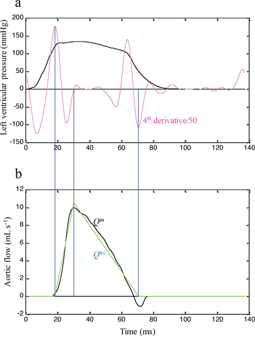 Figure 3: Construction of Qtri (green curve, b) from the fourth-order derivative (pink curve, a) of the measured LV pressure (black curve, a) in the same rat, which is shown in Figure 2. LV, left ventricular; Qm, measured aortic flow; Qtri, assumed triangular flow.