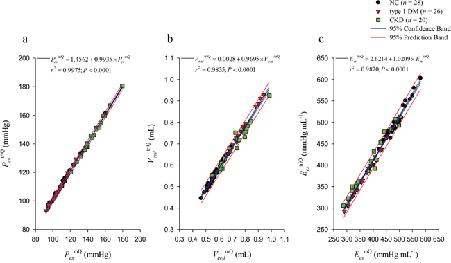 Figure 5: Relations between Pes (a), Veed (b), and Ees (c) calculated from the measured LV pressure and Qm (PesmQ, VeedmQ, and EesmQ, respectively, on the horizontal axes) and Pes, Veed, and Ees calculated from the measured LV pressure and Qtri (PestriQ, VeedtriQ, and EestriQ, respectively, on the vertical axes). Ees, end-systolic elastance; LV, left ventricular; Pes, end-systolic pressure; Qm, measured aortic flow; Qtri, assumed triangular flow; Veed, effective end-diastolic volume; NC, normal controls; type 1 DM, streptozotocin-induced diabetic rats; CKD, rats with chronic kidney disease.