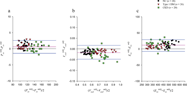 Figure 6: Bland–Altman plots of Pes (a), Veed (b), and Ees (c). Pink lines represent averages; blue lines denote 95% confidence intervals. Ees, end-systolic elastance; Pes, end-systolic pressure; Veed, effective end-diastolic volume; NC, normal controls; type 1 DM, streptozotocin-induced diabetic rats; CKD, rats with chronic kidney disease.