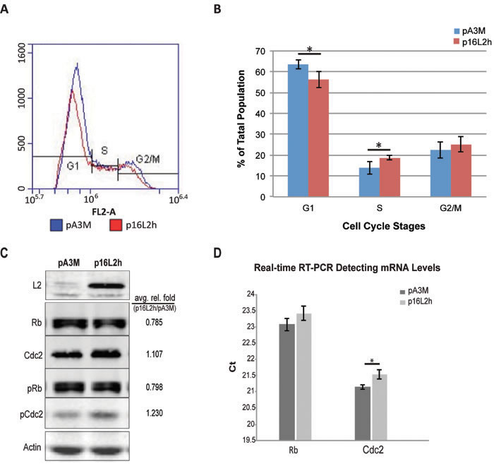 When comparing cell numbers after transfection, total cell counts dropped after L2 expression (Table 1, total number of cells). The bar graph in Figure 1B shows the average number of population of each phase from three experimental repeats. In summary, these data indicated that 16L2 led to a switch of cell cycle with more cells into S phase.