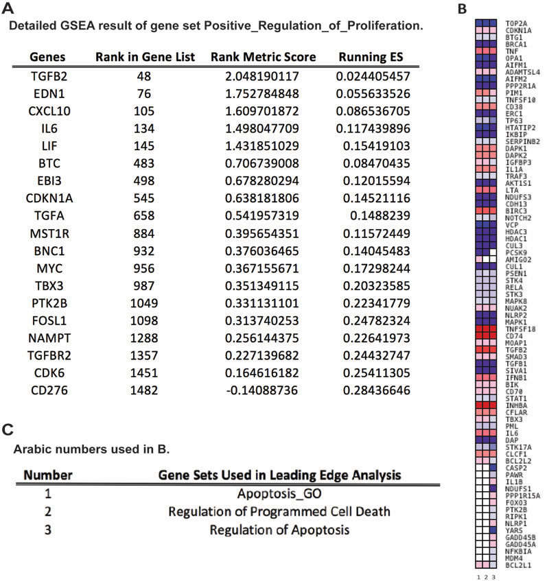 Figure 4: Leading Edge Analysis (LEA) reveals core genes that account for the gene set’s enrichment signal, as well as genes that are overlapped among gene sets. A. Table of detailed GSEA results of enriched gene set “Positive Regulation of Cell Proliferation”. ES: Enrichment Score. B. Heatmap of clustered genes in the leading edge subsets of gene sets related to apoptosis and programmed cell death. Red and blue colors indicate positively and negatively regulated transcripts, respectively, upon HPV16 L2 protein expression. Darker the color, greater the fold difference. Rows are genes in leading edge subsets; columns are gene sets, which are labeled as 1 to 3. C. Table of explanations for Arabic numbers used in B.