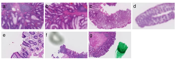 Figure 1: Seven tissues classified as Unclassifiable(X). The following images are excerpts from the tissue images. (a)-(d) Overall blurred images. (e) Partial blurred image. (f) Image with shadow close by a tissue. (g) Image with a pen mark.