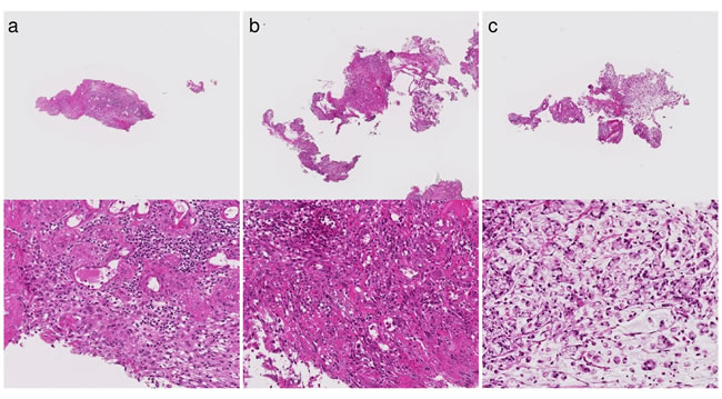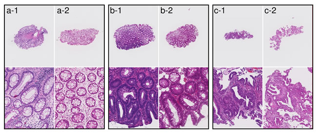 Figure 2: Examples of tissue images from Tokyo hospital and East hospital. (a-1), (b-1), and (c-1) Examples of tissue images at Tokyo hospital. (a-2), (b-2), and (c-2) Examples of tissue images at East hospital. Differences in slide preparation between two batches give rise to differences in image colors.