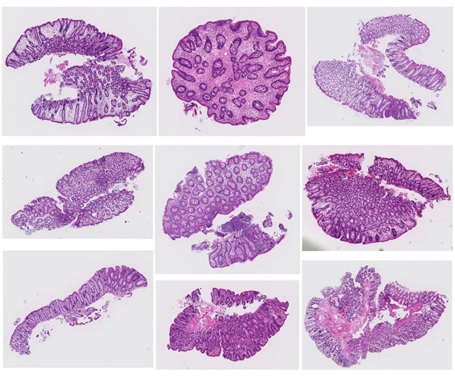 The co-authors at the NEC Corporation have developed an automated pathological image analysis system for colorectal biopsy specimens, named “e-Pathologist”. This system detects abnormal tissue suggestive of malignancy on hematoxylin and eosin (H&E)-stained sections and gives alerts to the user (i.e. pathologists) to reduce the risk of incorrect diagnoses. This system automatically detects and analyses WSI files generated by a digital slide scanner. The general flow of this system is as follows: This system distinguishes between adjacent tissues in the whole image, and recognizes each tissue as an individual entity. Each tissue region is then cropped from the WSI at 20x magnification (average image size is 10,000x10,000 pixels). Each tissue image is further analyzed and classified as four categories: suspicious for carcinoma, suspicious for adenoma, no neoplasia, and unclassifiable.
