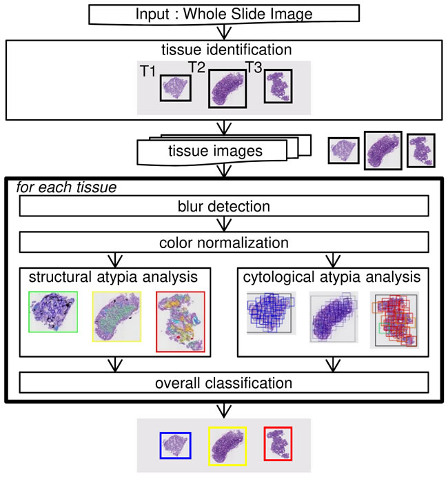 The whole structure of our protocol is shown in Figure 5. When a WSI is first accepted, each tissue region is identified one by one from the low-resolution image of whole area. Following this, the corresponding high-resolution images get retrieved from the WSI. Then, the following processes are performed for each tissue image: blur detection, color normalization, cytological atypia analysis, structural atypia analysis, and overall classification. Finally, the image gets classified into one of the four categories, either: suspicious for carcinoma (Positive), suspicious for adenoma (Adenoma), no neoplasia (Negative), or unclassifiable (Unclassifiable) for each tissue. The similarities between the revised Vienna classification, the Japanese group classification, and the final output of our system are summarized in Table 1. The classifier in each of the six processes had been trained using the training set, and its parameters had been tuned using the validation set, in advance. The system had not been modified using the data derived from either Tokyo hospital or East hospital. The details of our approach are described in the following subsections, which correspond with each of the steps.