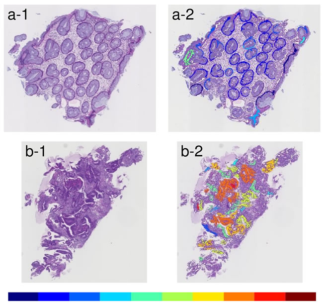 Figure 6: Examples of results that indicated glandular level by ten different colors between cool and warm. (a-1) An example of an input image with low grade atypia. (a-2) Visualization-displayed glandular level of the input image a-1. (b-1) An example of an input image with high grade atypia. (b-2) Visualization-displayed glandular level of the input image b-1. Warm colors indicate a thicker object and cool colors indicate a thinner object.